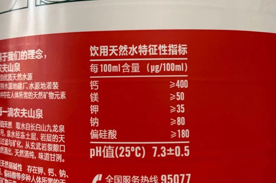 可以看下农夫山泉的参数:每100ml的含量最高的也就是钙,400μg,微克