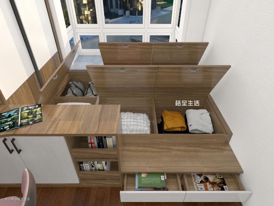 根据尺寸大小可以塞到沙发下面、床底下、茶几下面等,提高空间利用率,或者直接定制榻榻米一体式床、利用飘窗位定制收纳柜,这样床下、飘窗位多出的空间就可以放书啦~
