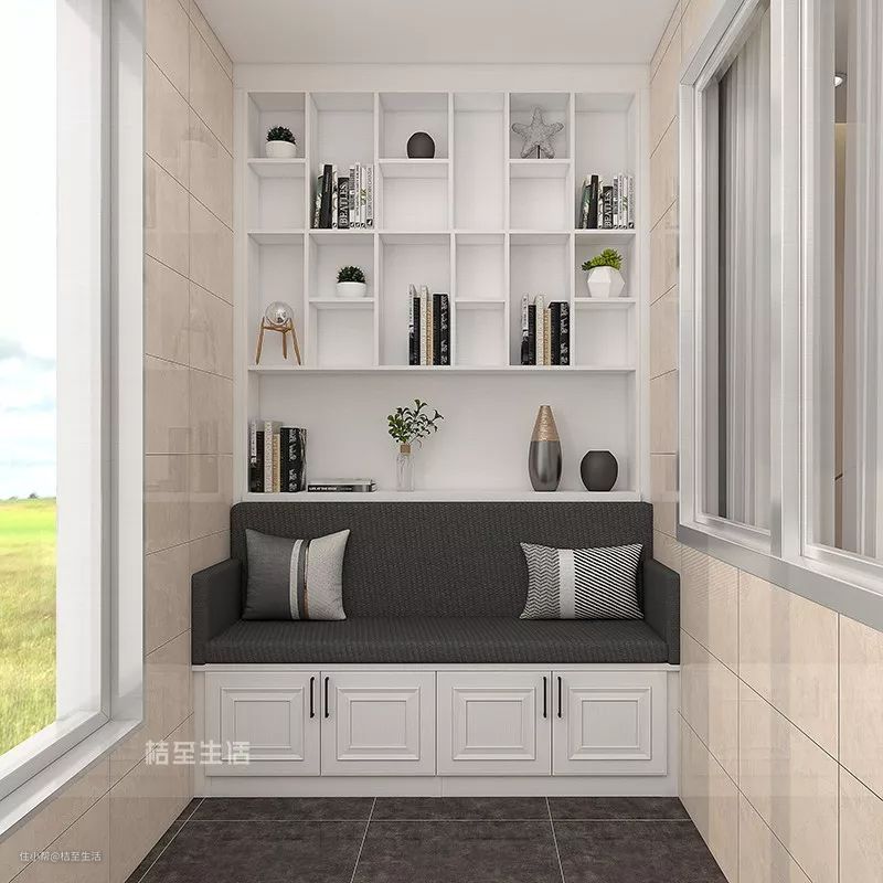 另在阳台地柜上加上一张软垫,“省空间”阅读区打造完毕。