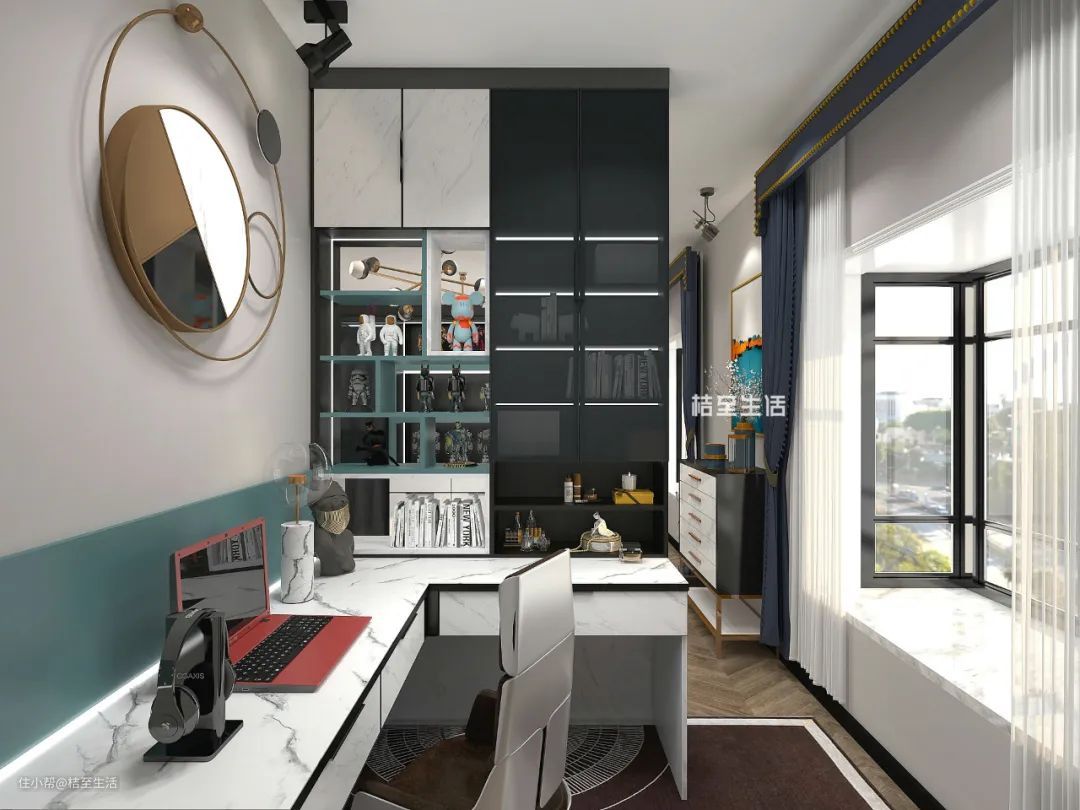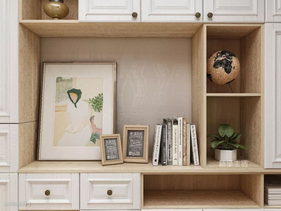 在书桌上安装置物架,或直接定制自带置物架的书桌,并采取开放式摆放,更方便工作时随手取阅。