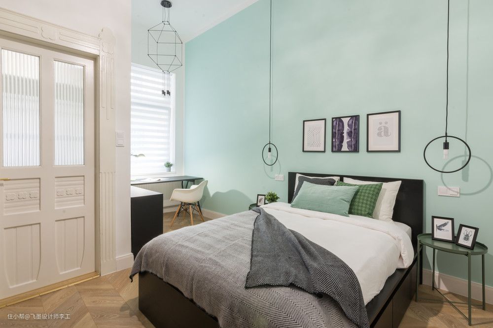 主卧和次卧的床头背景墙的配色都非常的小清新,蓝、绿2色,正好迎合现在的春夏季节,为整个家居氛围增添一丝活力。
