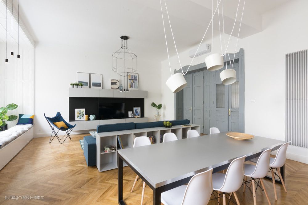 至于客厅餐厅之间的隔断设计,更不得不让人佩服了,仅靠沙发后用置物架充当和餐厅区域的隔断,上面可以置物充当沙发边几的作用,下面做书架收纳,一物多用!