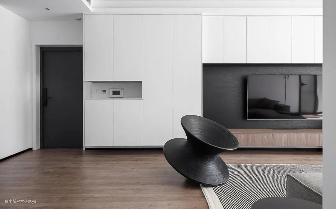 3、鞋柜和电视柜一起设计,也是不错的选择,在电视柜侧面与大门相连地方,做一个鞋柜收纳。