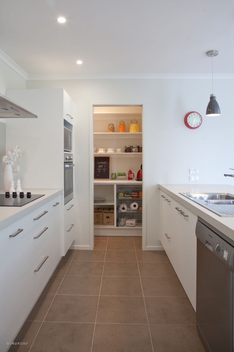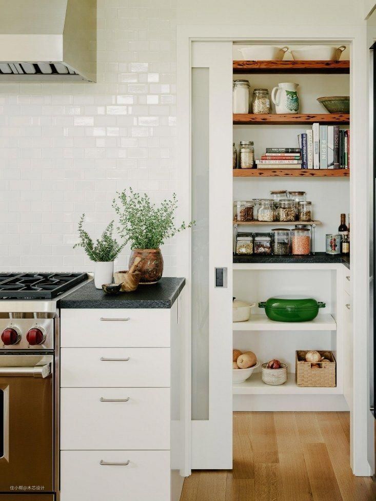 还可以通过橱柜、墙面的隔断,打造一个隐藏的厨房储物间,完全不影响厨房的整体布局以及视觉效果。