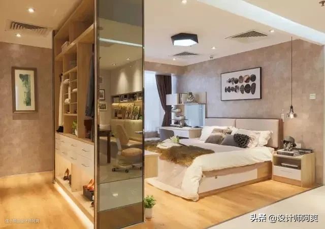 2、设计L型衣帽间, 巧妙将卫生间和床隔开来,等于顺便增加一个小型衣帽间。一举两得。