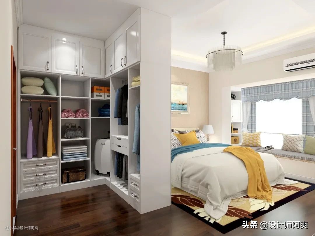 3、还可以设计U型衣帽间,避免卫生间直对床头问题,而且可以在床尾留出较宽的通道,让主卧的储物量翻倍。