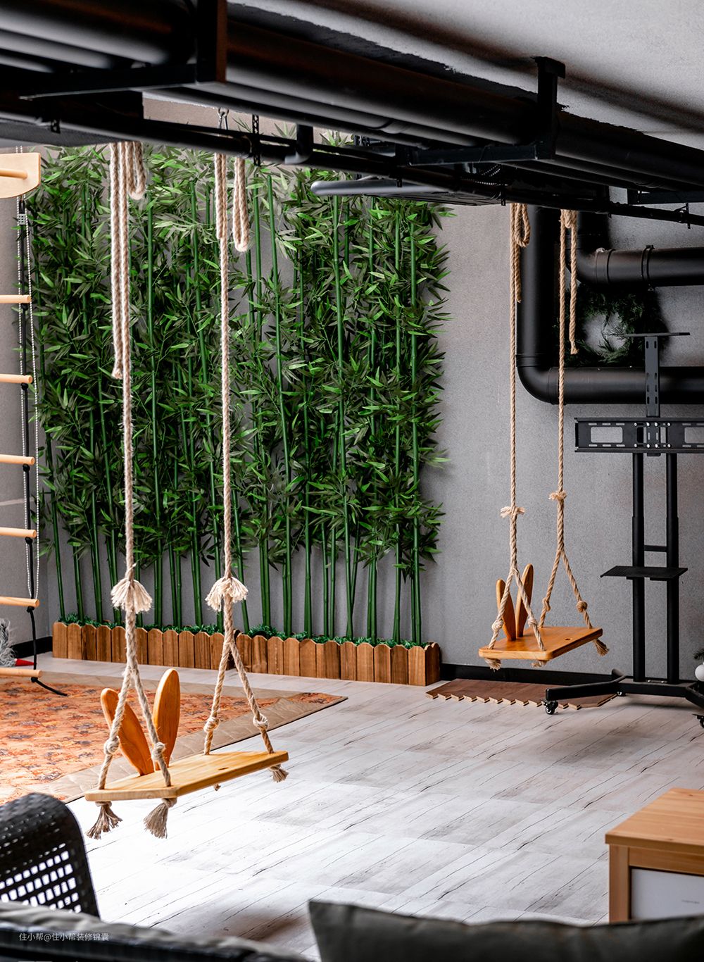 有孩子的家庭一定少不了秋千,在休闲区搭建两个秋千,既有观赏性,更有实用性。父母在休养,孩子还嬉戏,天伦之乐也不过如此。