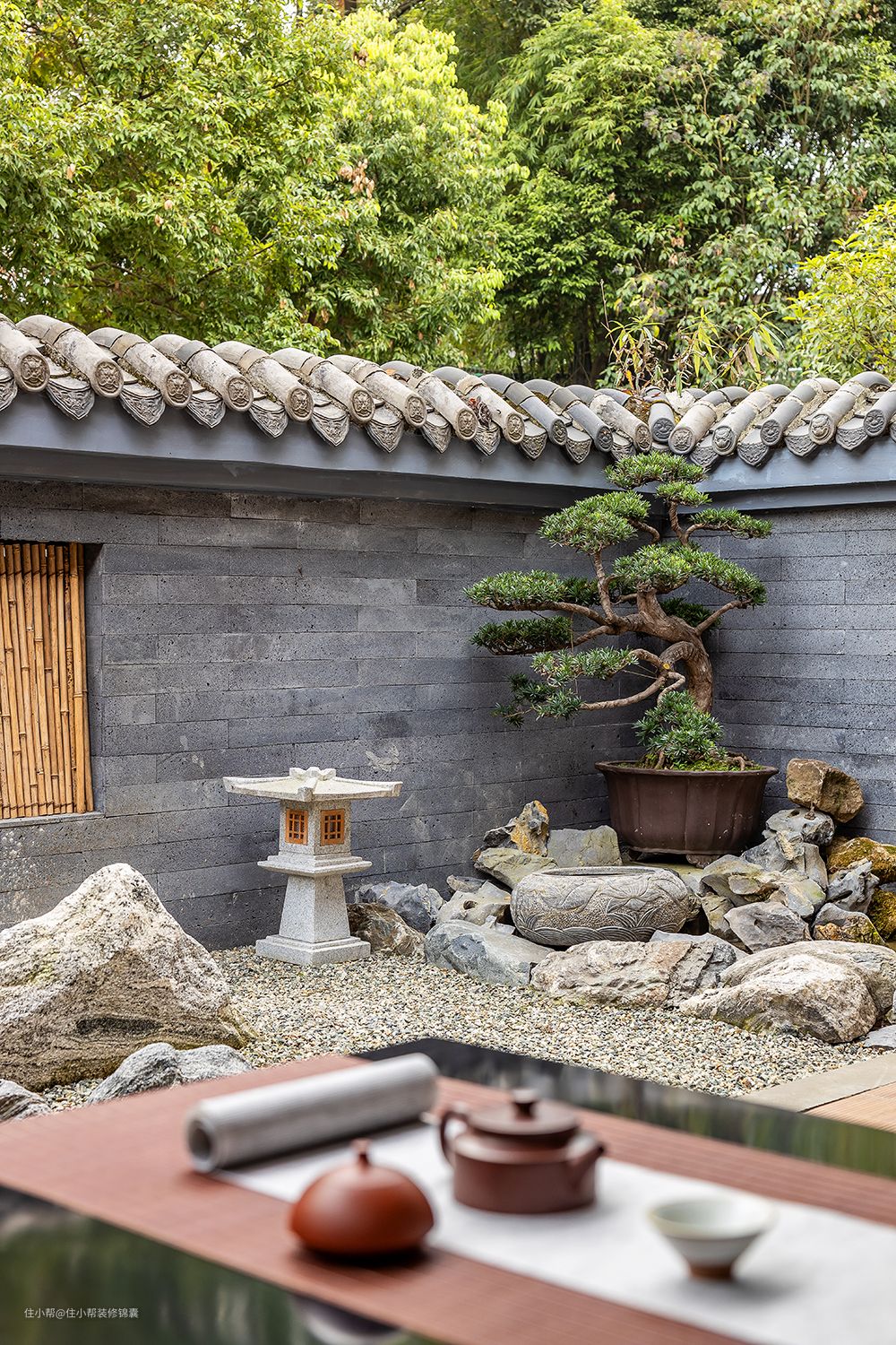 盆景、石块,再加上复古设计的摆件,院子中的水池与周围的环境相得益彰,再加上几盏茶杯,“禅”的意蕴仿佛已经呼之欲出。