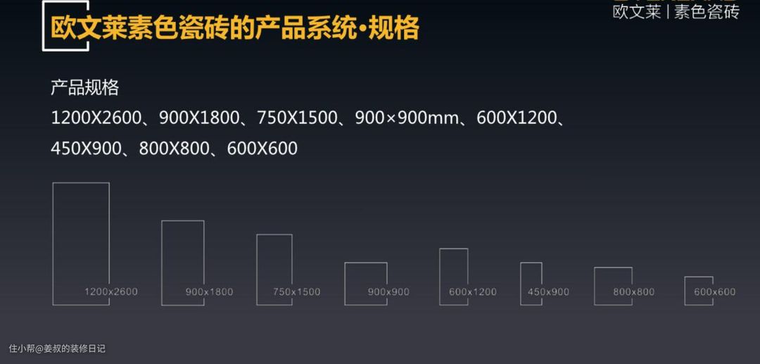 大瓷砖和小瓷砖展示出的空间感是截然不同的,客厅或者卧室适合用大尺寸瓷砖,因为这样铺装出来的效果会在视觉上显大,一般选用80cm*80cm较多,但是也有一些非常规尺寸,比如欧文莱提供120cm*260cm超大尺寸。
