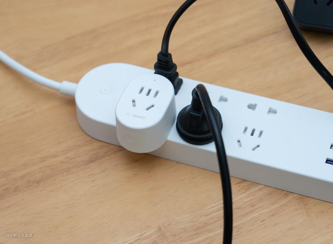 再就是,正泰这款智能插座个头很小,在插座上占用的位置也就非常少了,大家看下图,另一款智能插座接到插排上之后,周围的插孔就无法插入其它设备了。