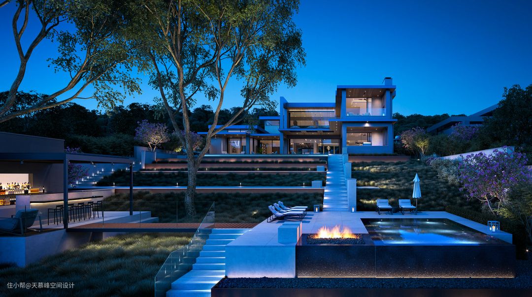 现代风格庭院设计,提供了一种特殊的宁静感,夜晚降临,灯光营造出安静祥和的氛围