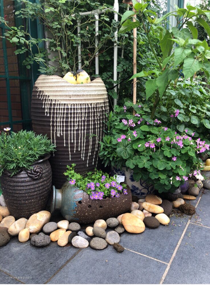 庭院一角,鹅卵石、瓷瓶、打破固有的形态,展现出花、草顽强的生命力,生机勃勃