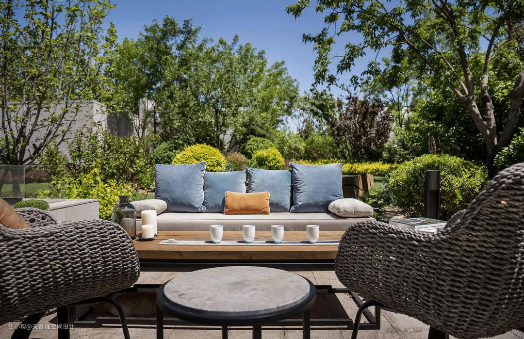 沙发、藤编椅,防腐木地面,一处聊天聚会的好去处,大面积的绿植区域,仿佛处身于森林当中,当夏季夜晚袭来,听虫鸣声,看漫天星