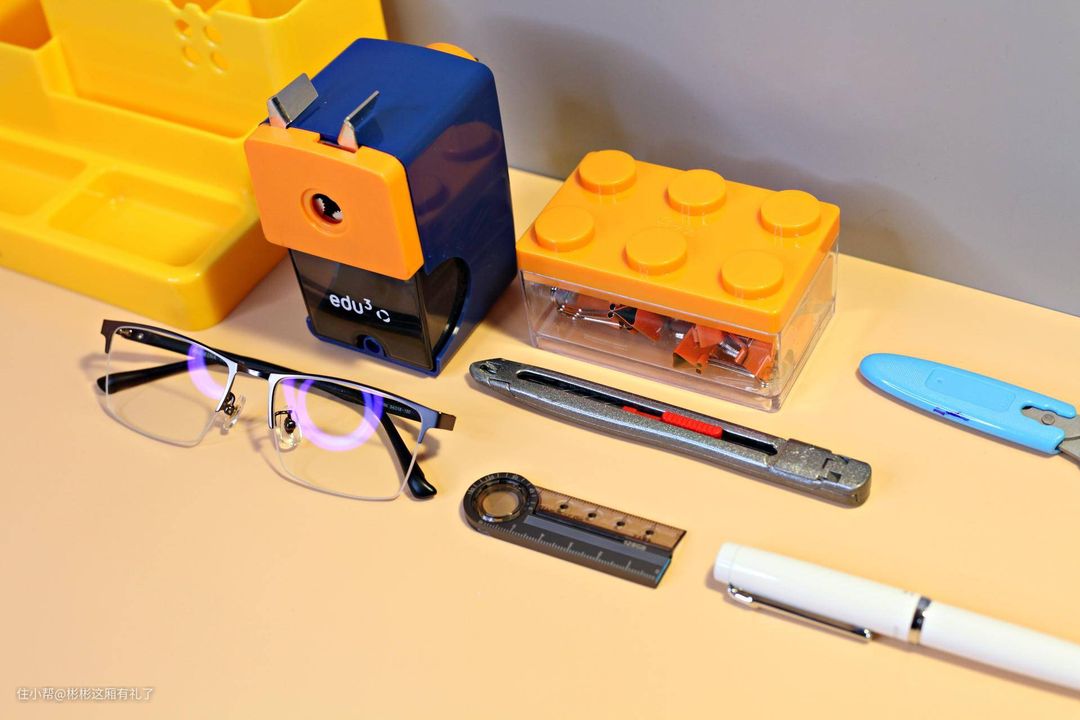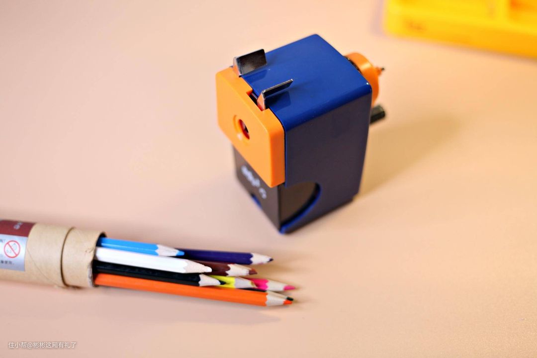 ▲除了蓝色和橙黄色的撞色设计很好看之外,这个卷笔刀也是很好用,在尾部有一个小旋钮,可以调整笔尖的大小,毕竟很多时候,我们并不需要铅笔芯太尖,毕竟容易折断。这个卷笔刀使用了这么多年,也没有损坏。另外还配有一个固定底座,可以固定在桌子边缘。