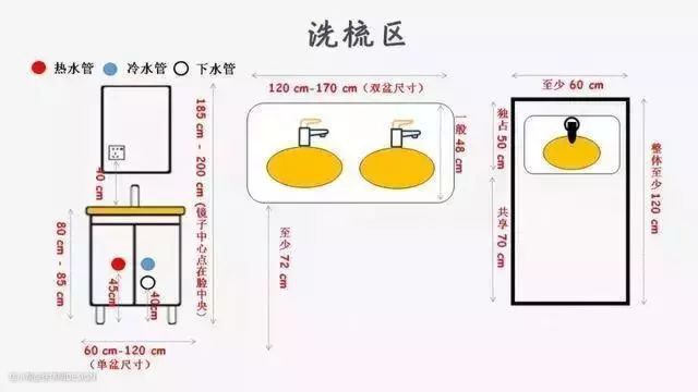 单盆60-120cm,双盆120-170cm,基本是市面上大部分单双盆的尺寸。如果单盆100cm以上可以把盆靠边设计,那么就可以获得较大台面。