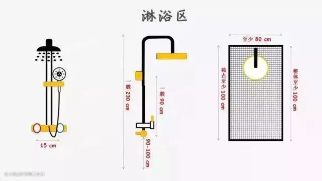 花洒安装高度在90-100cm,顶喷最高高度最好控制在230cm,因为大多家庭吊完顶只有240cm左右。