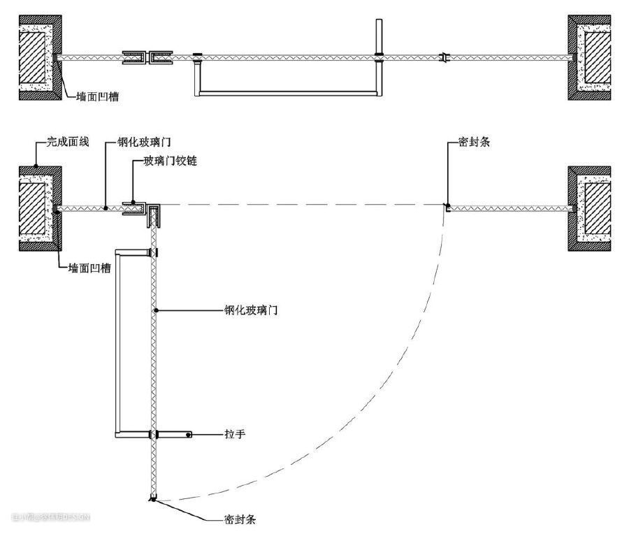 卫生间的玻璃门的固定方式有2种常见形式:门未靠边,通过合页与固定玻璃门扇固定在一起;门靠在墙边,通过合页与墙面进行固定。