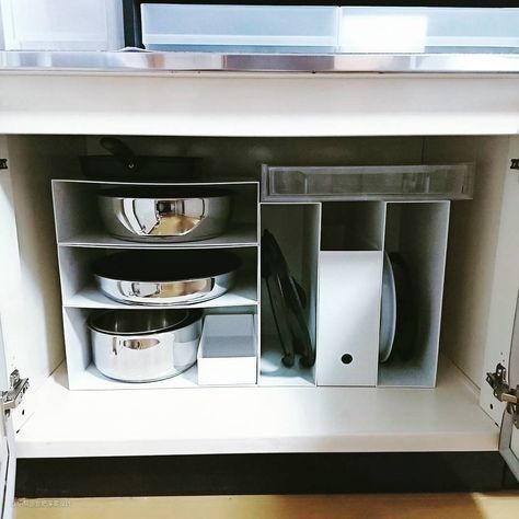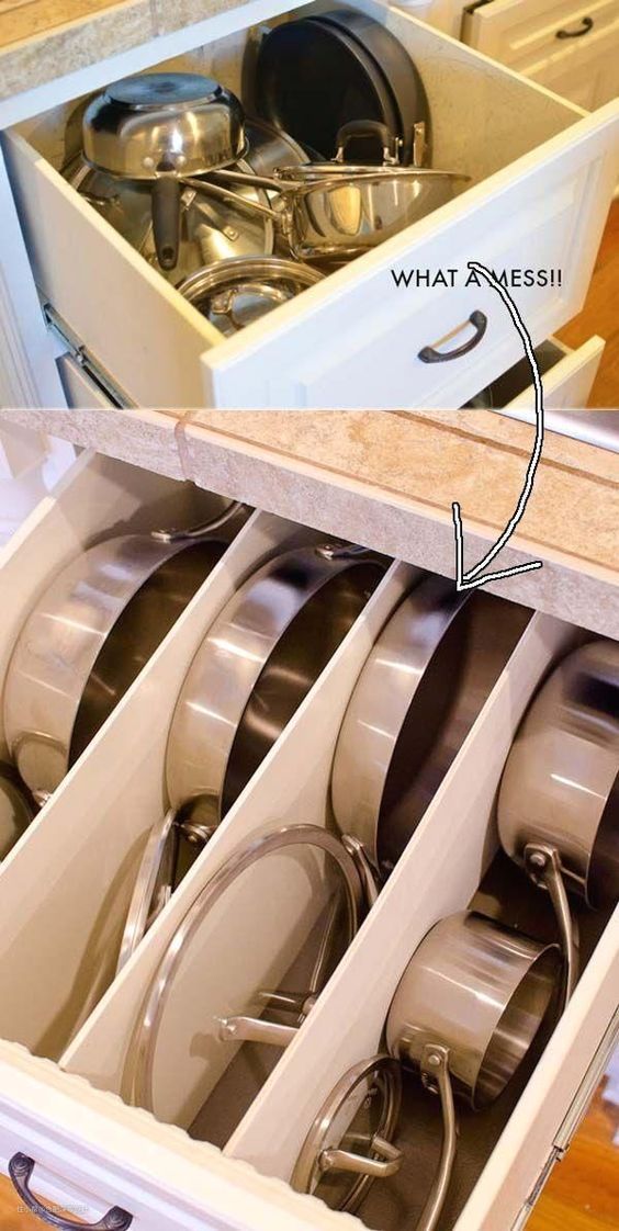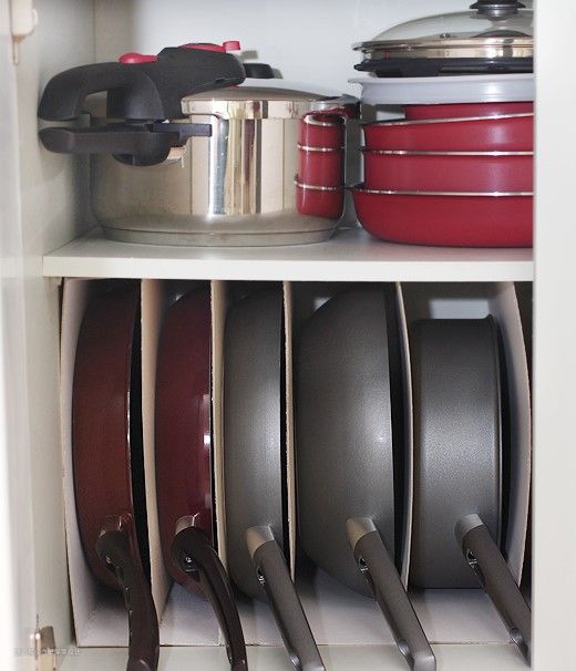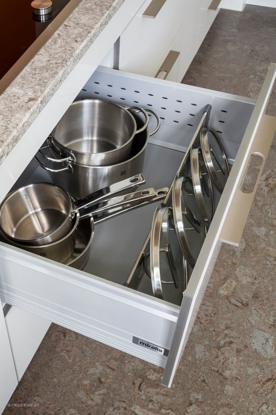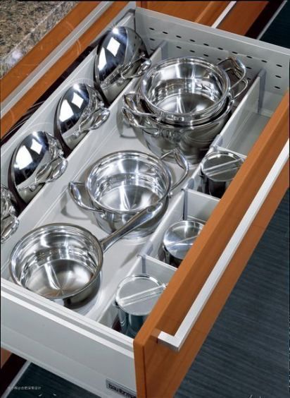 当然,最好的办法还是你在装修的时候,就能想到留出1、2个柜子专门放锅,这样空间稍微留足点,能放下不少的锅具,中间也没必要让师傅专门做分层,自己买点可活动的隔板放上,效果也不赖,最好能和盖子放在一起,这样拿取更加方便。