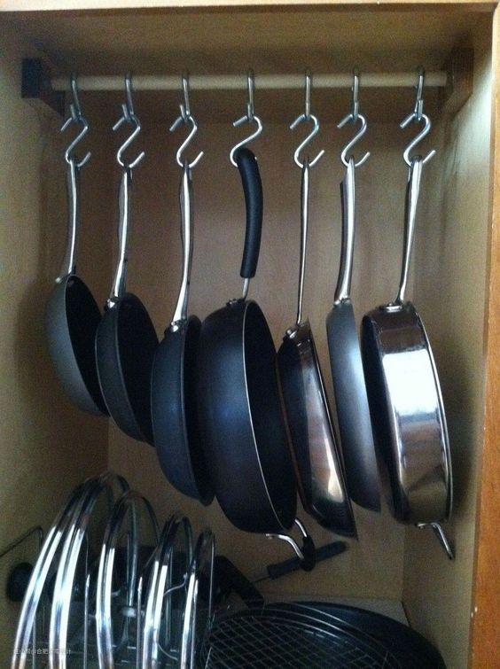 能挂就挂,不能挂就竖着收纳来省空间,配上挂杆和挂钩,下面刚好拿来放锅盖,实在没有独立的柜子可用,那就找水槽下借空间再好不过了。