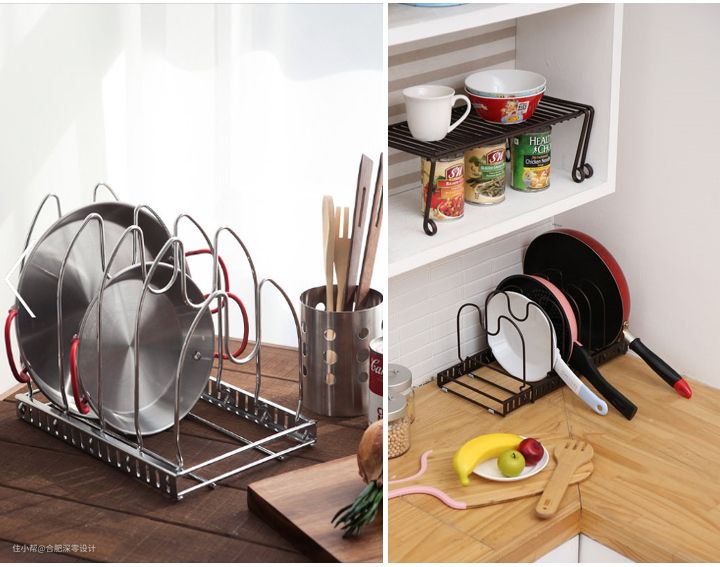 废话不多说,咱们用事实说话↓,放不是简单的搁在那里就完事了,而是要借助下其他的小道具,比如:竖状置物架等,管你家锅的大小都能帮助你放得整齐有序。