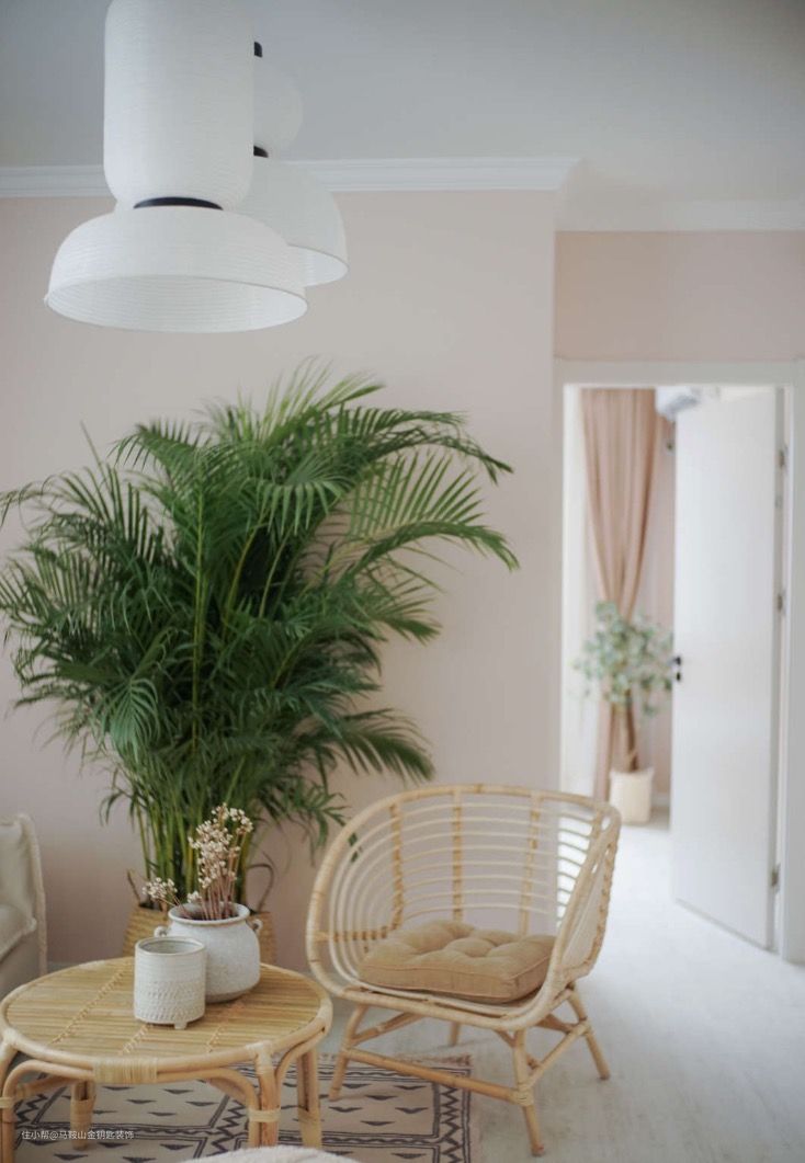 藤椅,藤编茶几,白布沙发,超大的夏威夷椰子,是不是有种仿佛在东南亚度假的错觉?墙面颜色是立邦色号:麦乳精。暖暖的米色调,让空间柔和好多。