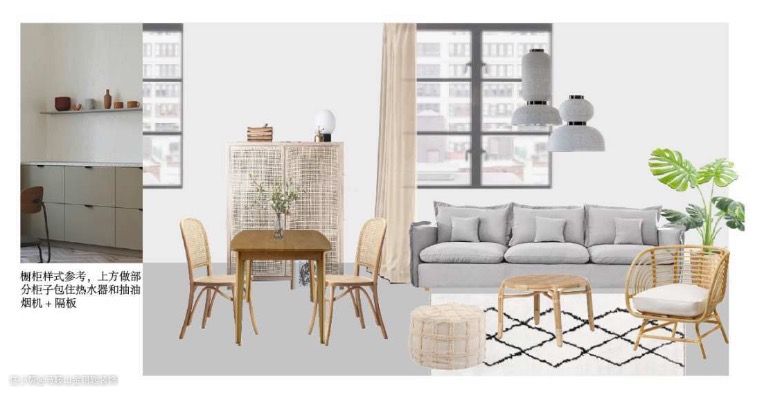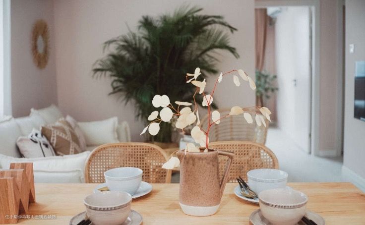餐厅是满满的木+藤编元素,搭配一些简洁的陶器。都是很自然原始的材料。餐厅的纸吊灯是我超喜欢用的一款。