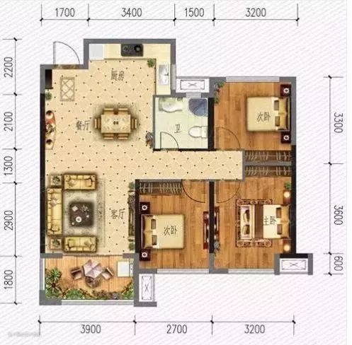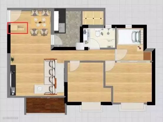 在没有玄关的情况,利用增加隔断墙/玄关柜的设计,创造出一个假的玄关,化解进门见厅的尴尬。如下图: