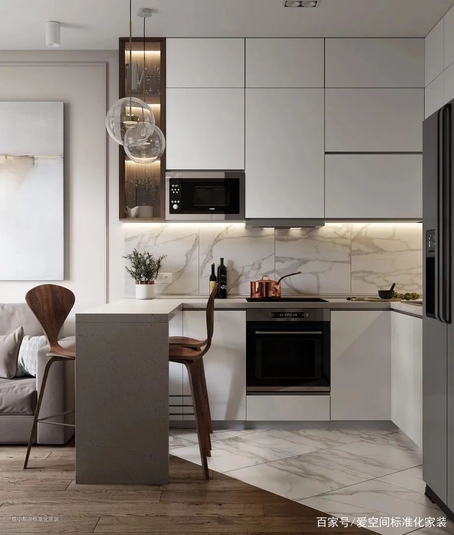 在L型厨房中设置一个简易的小吧台,不仅会让空间瞬间充满小资情调,符合当下对于精致生活的追求。