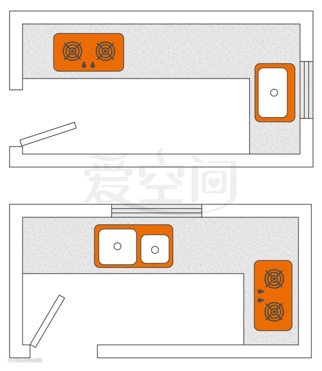 “L形”厨房宽度在1.4~1.6米左右,有两种常见形式: