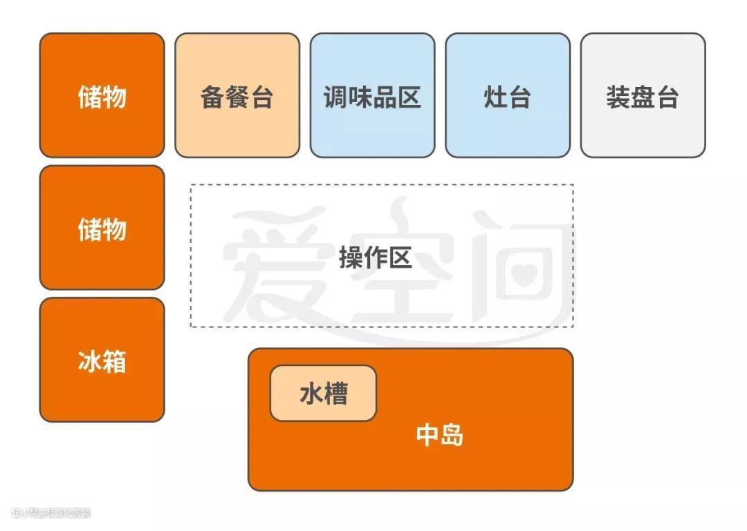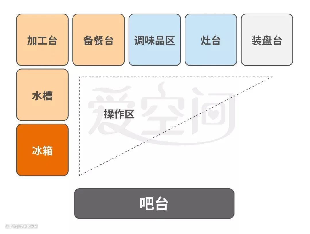 (a)储藏区→水槽在同一侧,水槽→灶台在转角两边