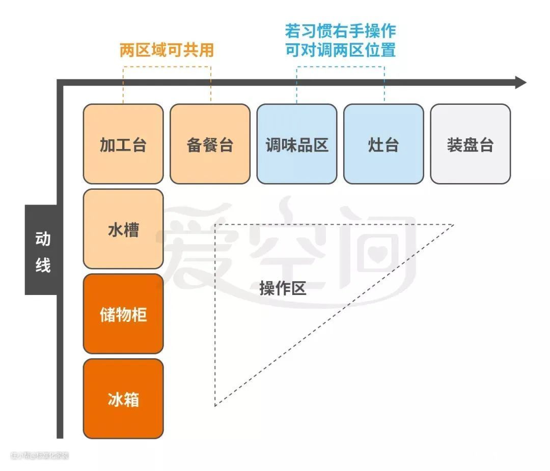 “L形”长的台面操作台别太长,不然切完菜你要走很远才能把菜放到锅里。