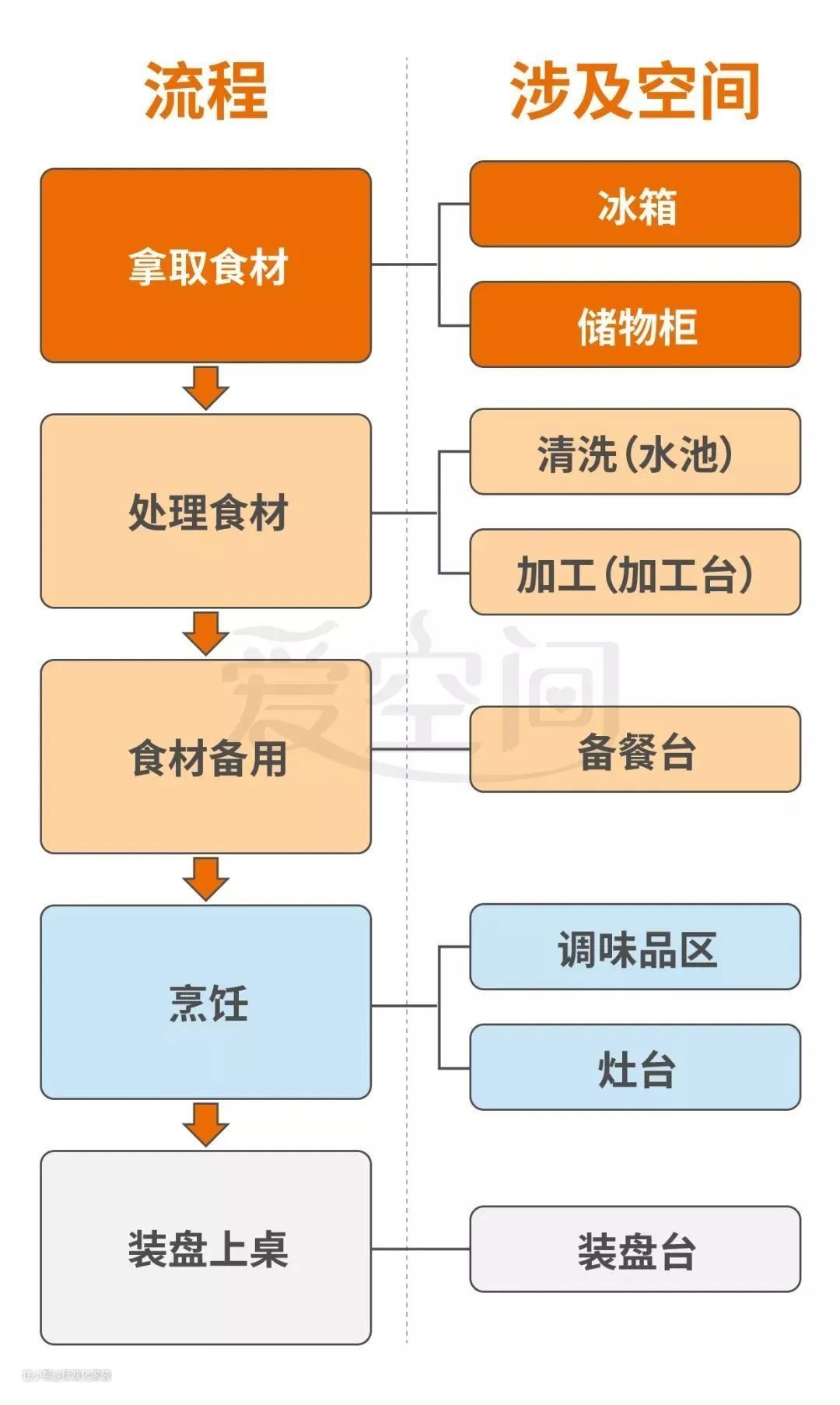 台面划分要根据烹饪流程,科学安排位置和动线,保证厨房操作高效便捷。