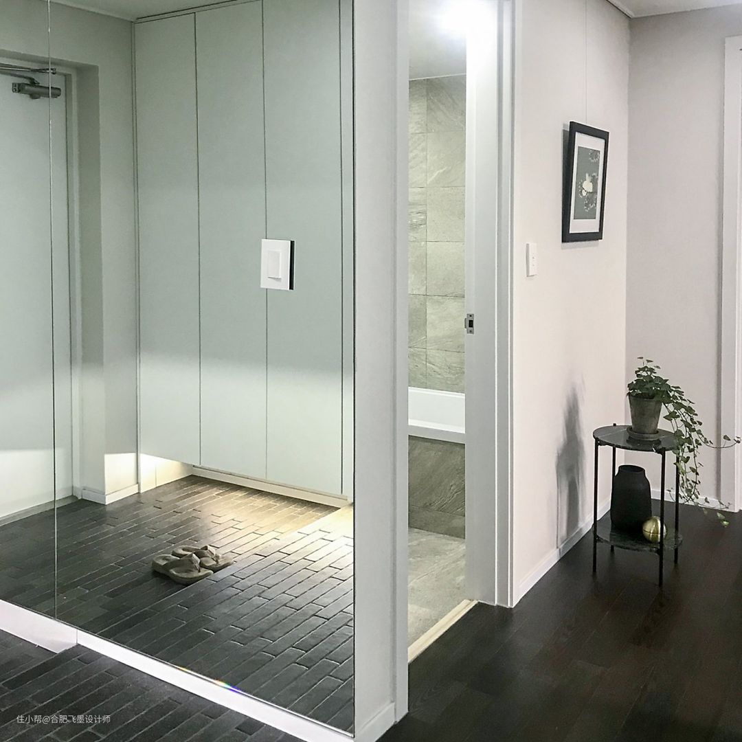 进门玄关处,2边墙面都做了收纳设计,一面是到顶的玄关柜,特意底部留空20公分加灯带做换鞋区,对面做镜面柜,进出直接拥有了一面超大全身镜。
