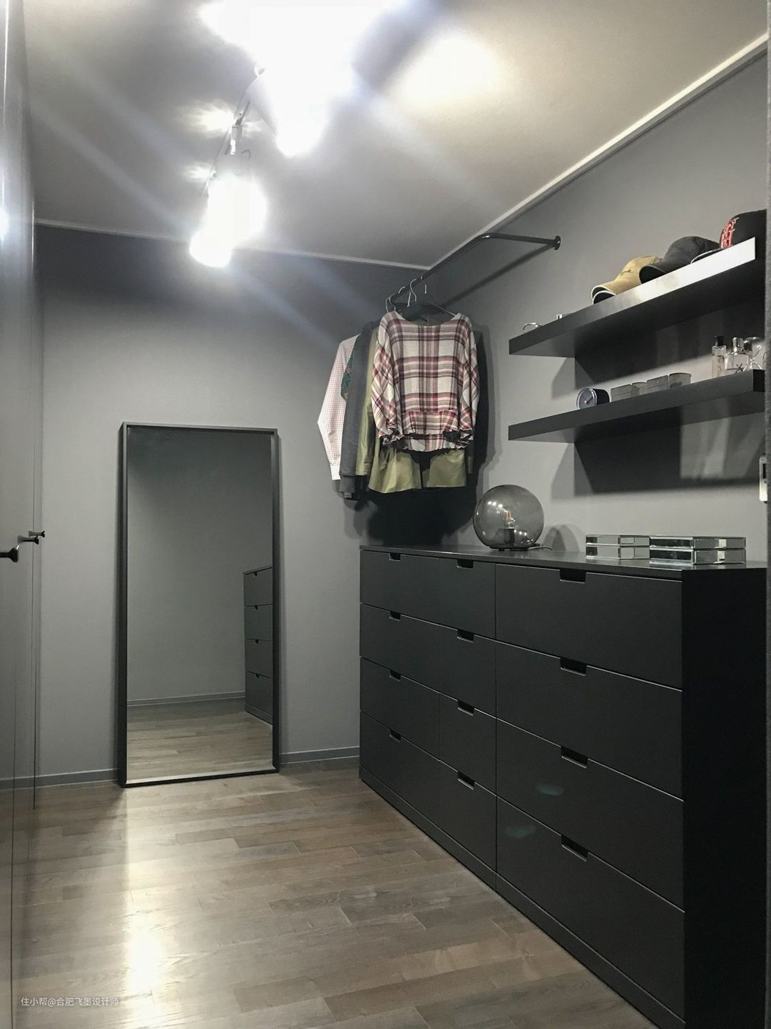 来到俩人的衣帽间,果然也和普通人家不一样,没有一间房全打满柜子,而是一边是封闭式柜体收纳,一边是开放式收纳,安装挂衣杆、置物搁板,中间随意摆放上一个穿衣镜,打造出了大多人理想中的衣帽间。