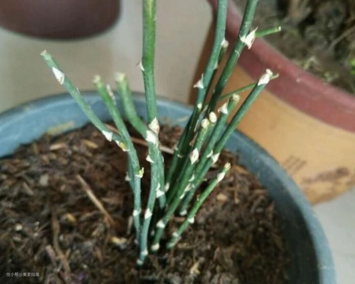 容易黄叶的盆栽,还有文竹。文竹又被称为是“文雅之竹”,它很适合摆放在书房里。不过呢,很多人的文竹在养护不当的时候,容易出现叶状枝干枯的现象,黄黄的叶子显得文竹没有一点生机。此时建议花友们可以将文竹的叶子全部剪掉。如上图中的文竹一样。在剪掉文竹的叶子之后,就可以按照它的生长习性重新养护了。养文竹一定要注意一点,那就是不能见直射光线。一点散射光是利于文竹生长健壮的。