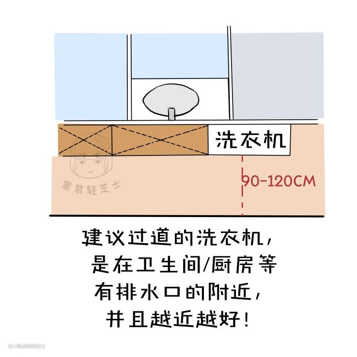 但是要考虑到芝妹开头说的两点,建议尽量靠近卫生间等区域。可以在卫生间/厨房相邻的走道上,放置洗衣机。