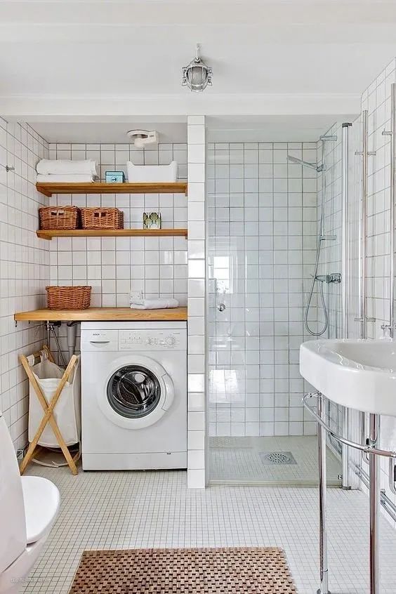 芝妹建议若是在卫生间放洗衣机,最好做好干湿分离。洗衣机在卫生间是怎么样安放呢?例如这样小卫生间可以与洗手台结合;↓↓↓