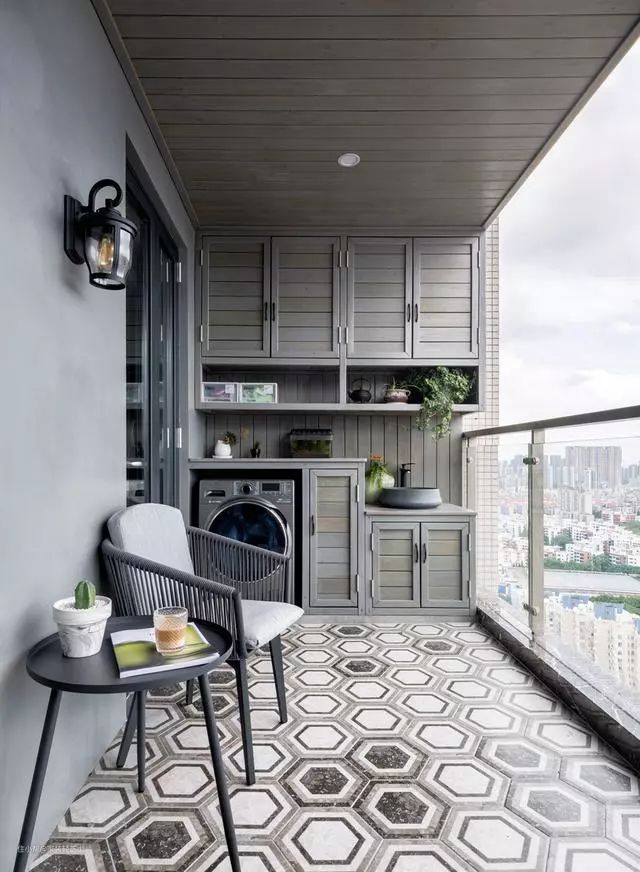 阳台是最适合放洗衣机的位置之一,我们可以洗完衣服后直接晾晒,动线更短。