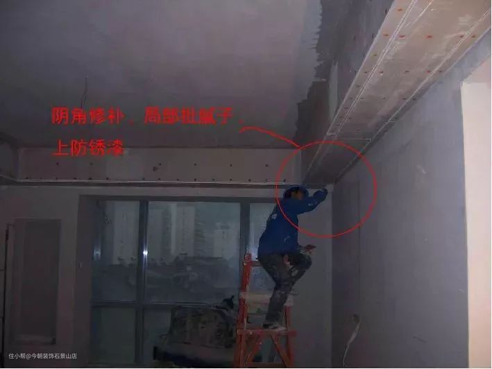 (8)在满批腻子前,应先做好阴阳角.阳角用铝合金直尺架角方正,阴角必须弹线修正。