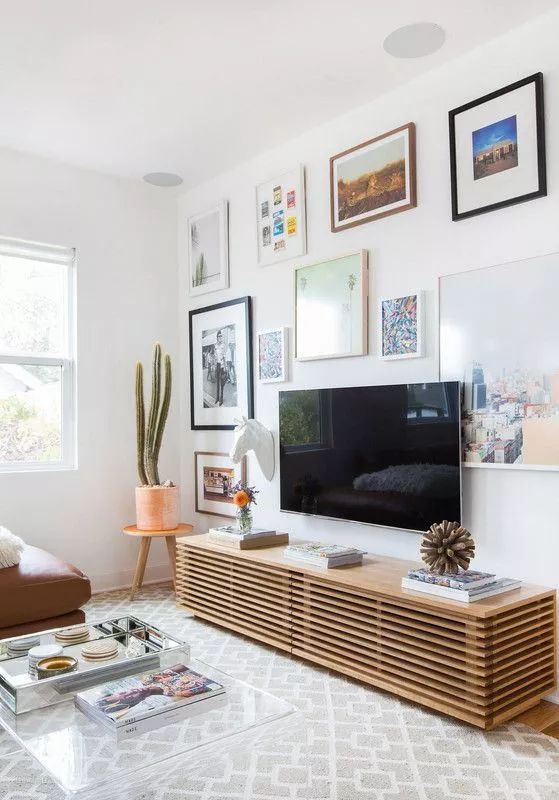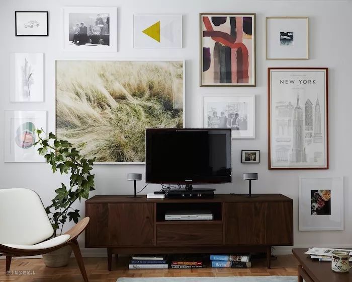 最省事(但不一定省钱)的方法:把电视周围挂满装饰画,让电视也成为其中一幅,电视背景墙变成做成艺术墙,还能展现主人的好品味。
