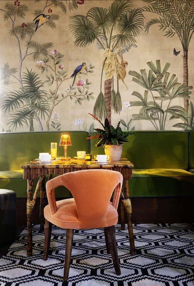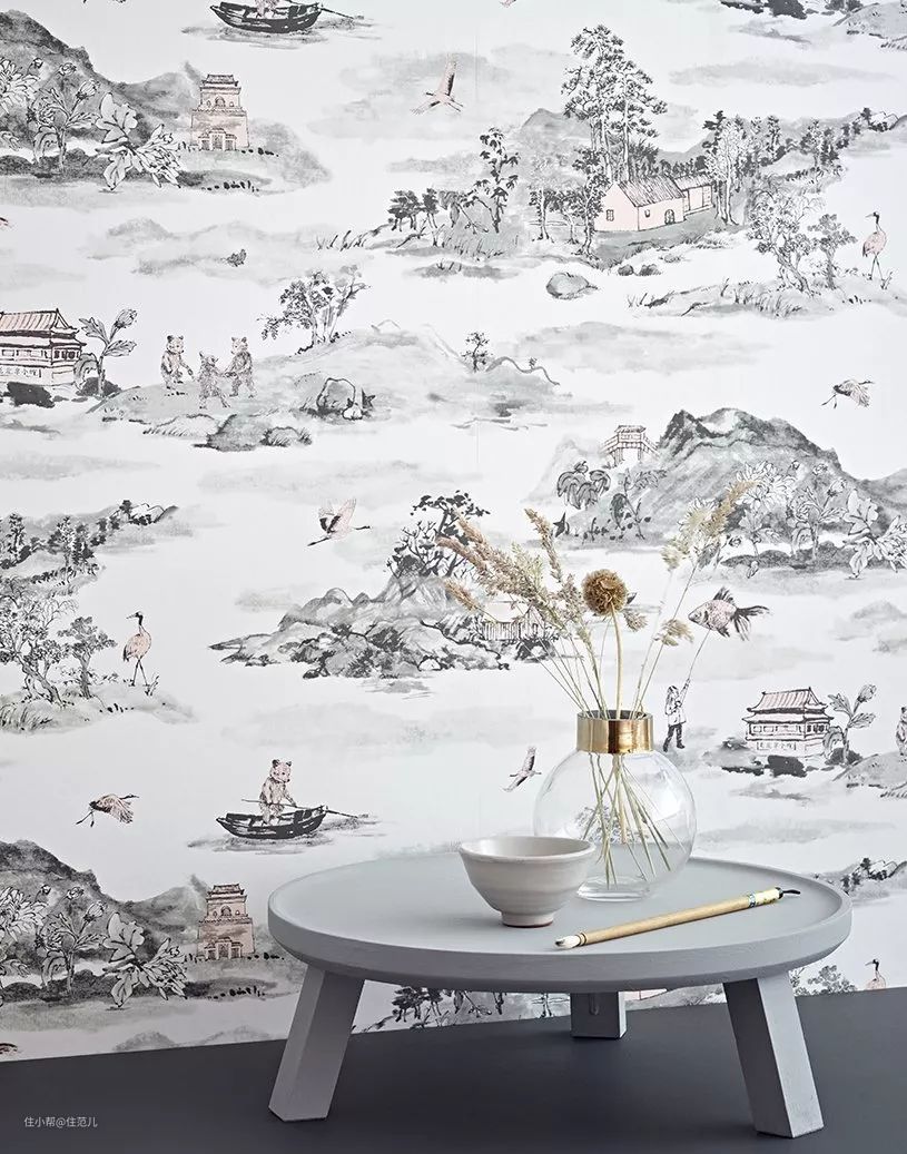 还有一种图案叫做“法式中国风”,用西方油画的方法,绘制凉亭、假山、花鸟、小人等中式图案,中西混搭,非常有趣。代表品牌是de Gournay,均价700~800元/平米。