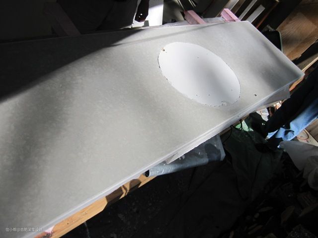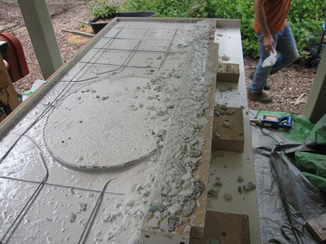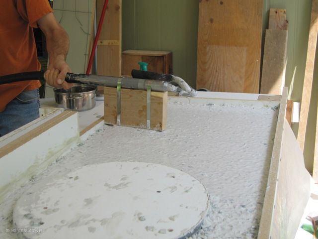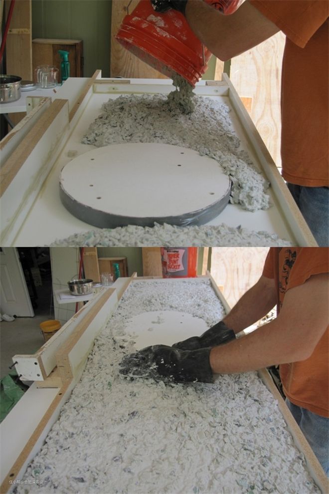 注意下,不要被玻璃碎片划到了手,最好提前戴上手套,至于这个怎么弄碎随你高兴就好,只需要将其碎片混入水泥里,拿来浇筑台面就好。需要安装水槽等的位置需要提前空出来哟~