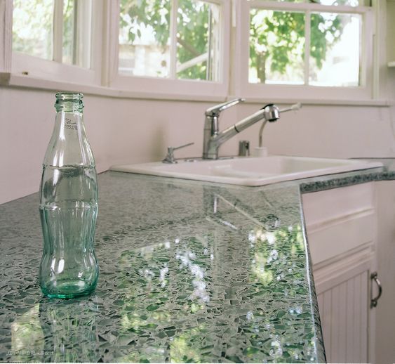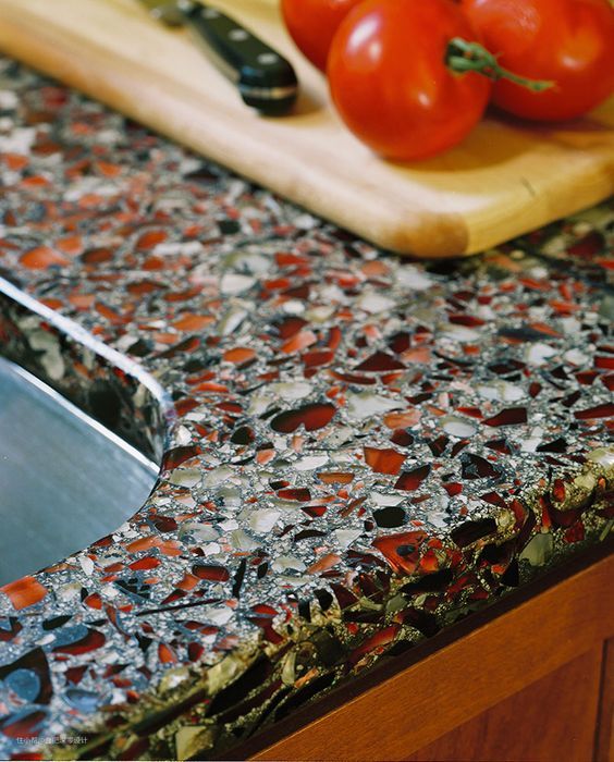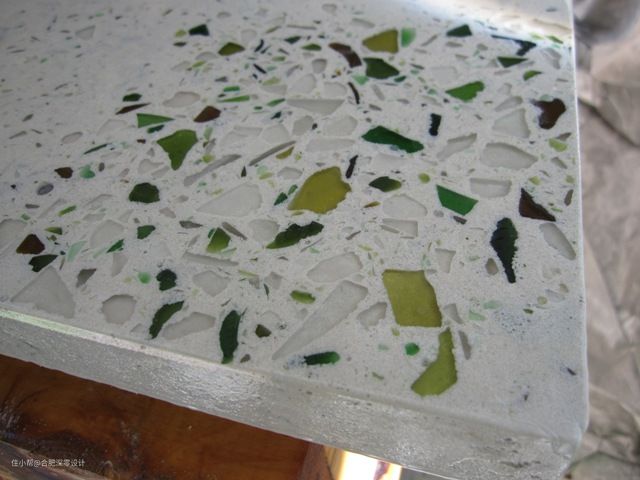 空了的玻璃瓶基本就是废品,碎了更是连废品都不是?这句话总是没毛病吧,但是这位朋友就用行动告诉了我们,成了碎渣渣的玻璃照样是个宝!下面这个就是他用玻璃瓶碎渣做出的厨房台面↓