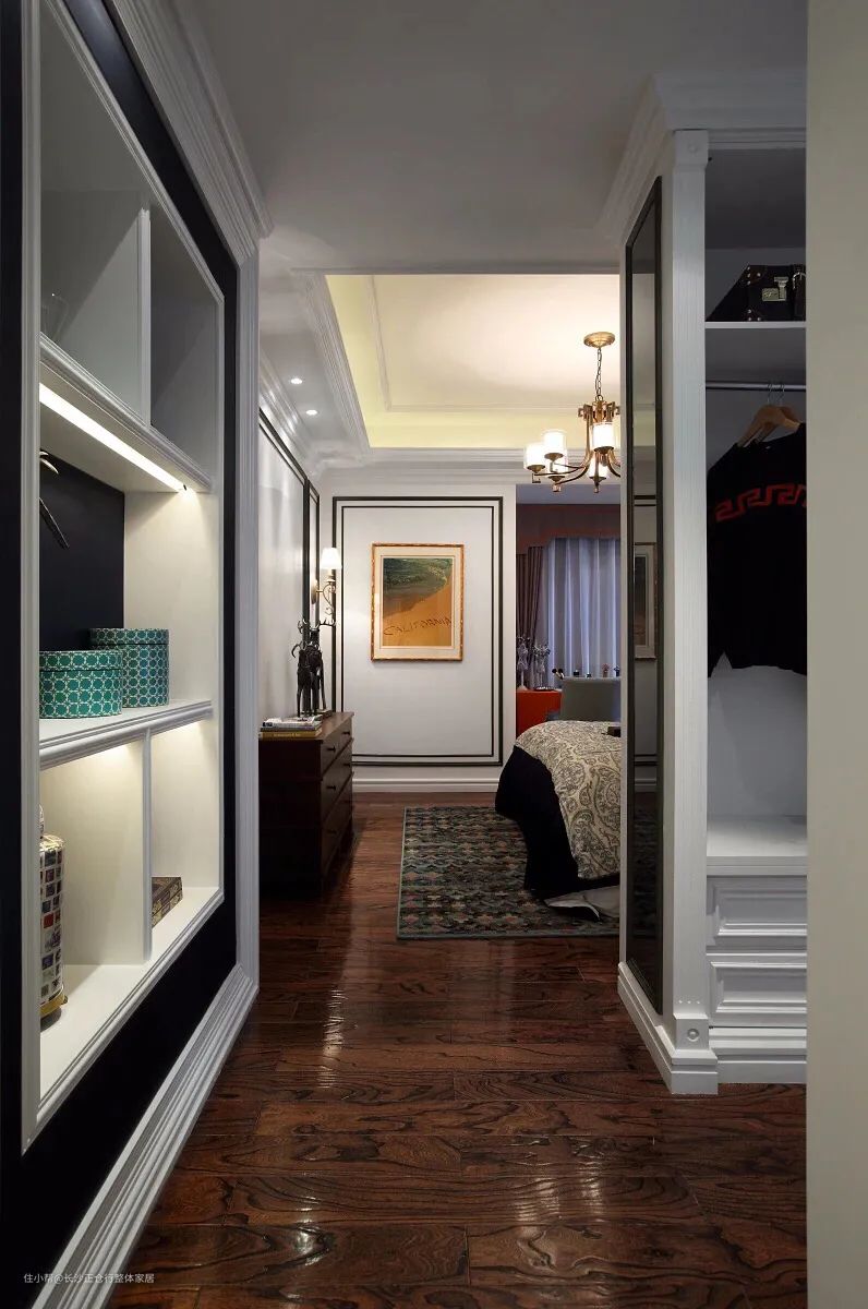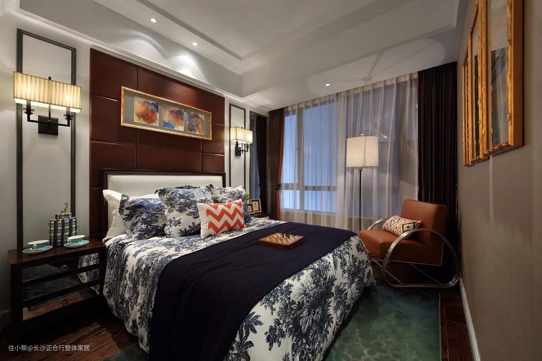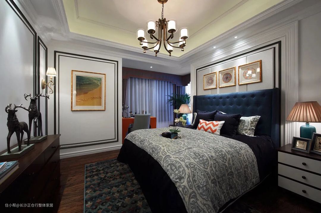 主卧室的设计,墙面造型,色彩的选用搭配上与整个空间主题呼应,墙面线条配蓝色布艺床具,点缀棉麻床品,提升了空间格调。主卧室的窗帘丢弃了欧式一贯采用的丝绒布艺,做的是中式风格带帘头的款式,中式的古朴典雅中和了欧式的贵气,让复古的调性从华丽中挣脱出来,多了分沉稳与内敛。
