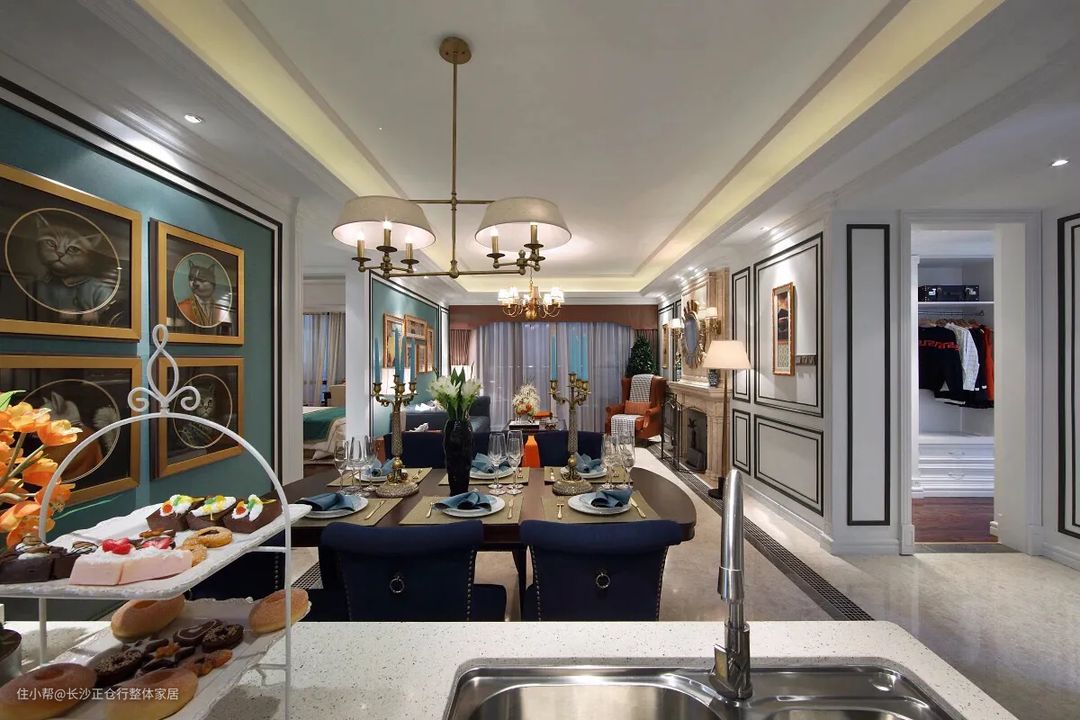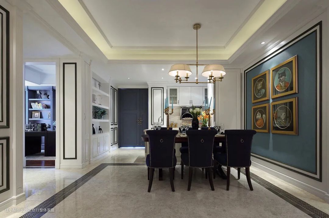 复古设计需要的并不是将过去的元素完全照搬,而是回顾属于不同年代的设计风格,融入现代的新式设计。餐厅复古风的表达还是延续在墙面及餐桌椅上,墙面欧式皇室装饰画,丝绒质感的餐桌椅,丝绒材质的选用本身就代表着一种高级,高贵气质彰显。在复制原有的元素基础上展现出具有吸引力的视觉效果。