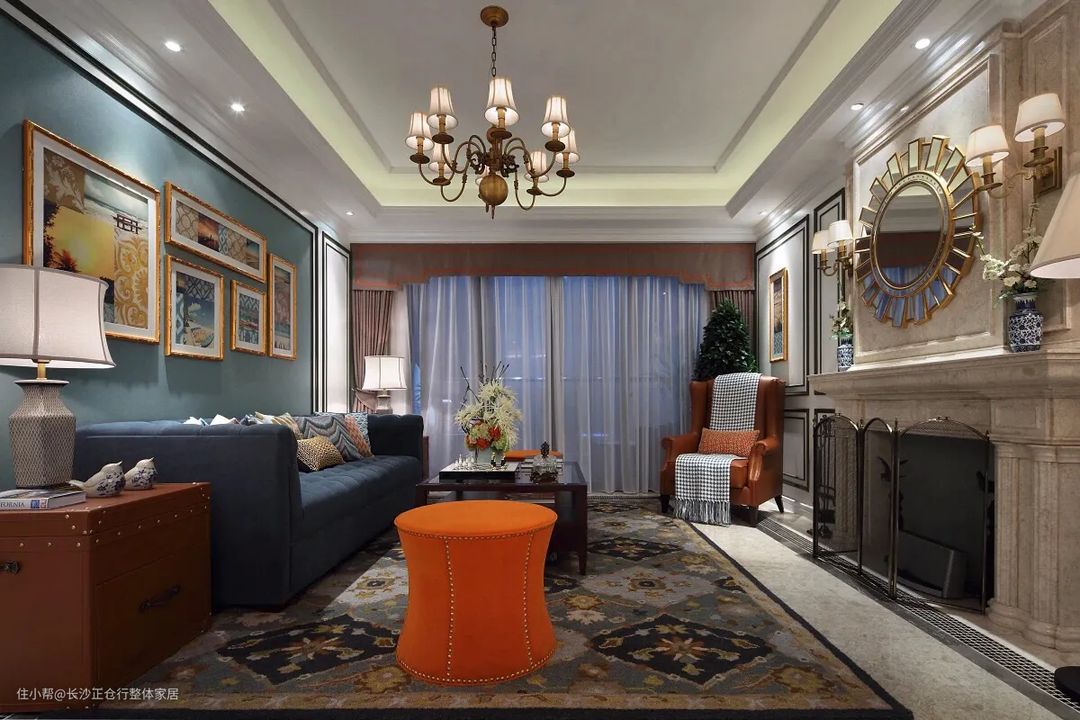 这个客厅空间以欧式复古艺术形式呈现,体现在细节之上,墙面护墙板丰富的造型,石膏线吊顶处理,以及最具欧式特点的罗马柱壁炉,再到墙上装饰画及挂画内容,每一幅画都采用金线框装裱,金色带来的小资感觉复古又浪漫。复古风的表达再落实到沙发家具搭配上,橙色铆钉质感的坐凳做跳色,复古皮质的单人椅、皮箱做的边几,以及欧式花纹的地毯,所有搭配融合在一起,颜色选择上层次分明,个体质感造型上调性统一,由时代的记忆所呈现出优雅浪漫的装饰效果,感受到烂漫的复古艺术。