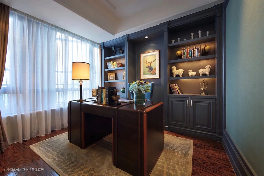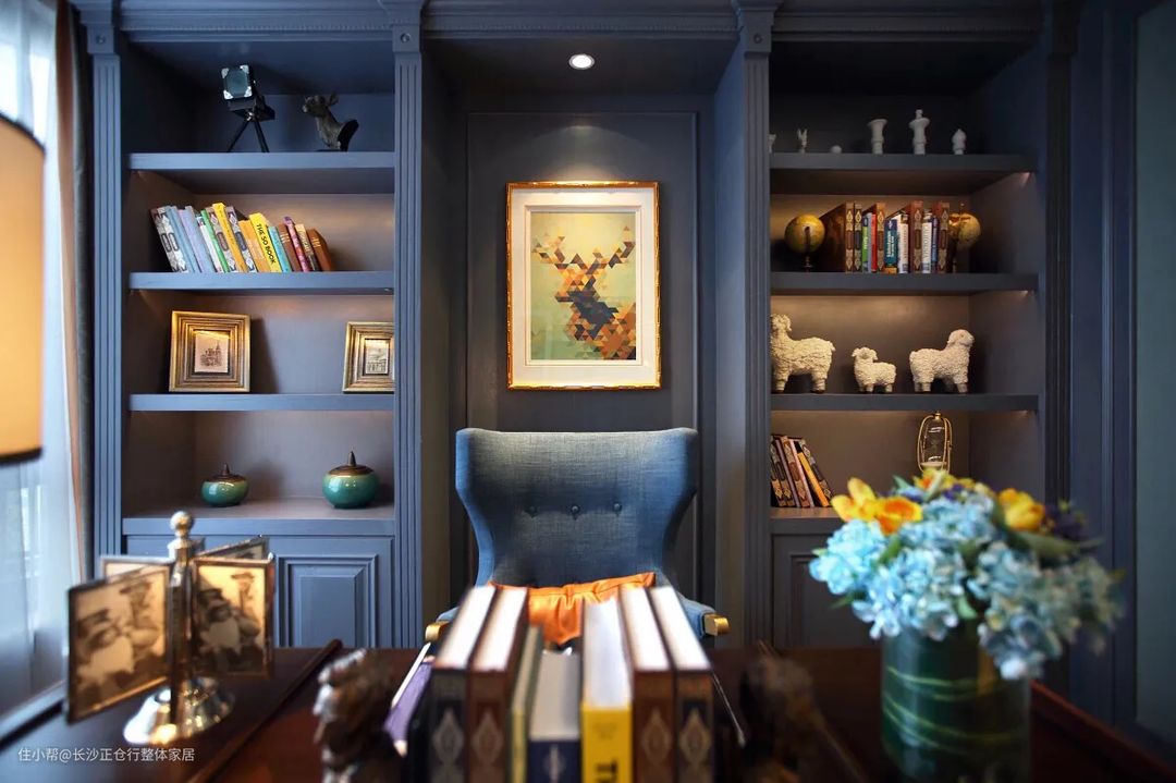 书房空间运用了色彩明度比较低的颜色,低明度蓝色的应用,这样的用色应用在空间里,具备了高级的小资格调的同时,有助于增加书房自带的安静,稳重的气质。各区域暖黄色的照明设计更加烘托出一个安静休憩的读书氛围。