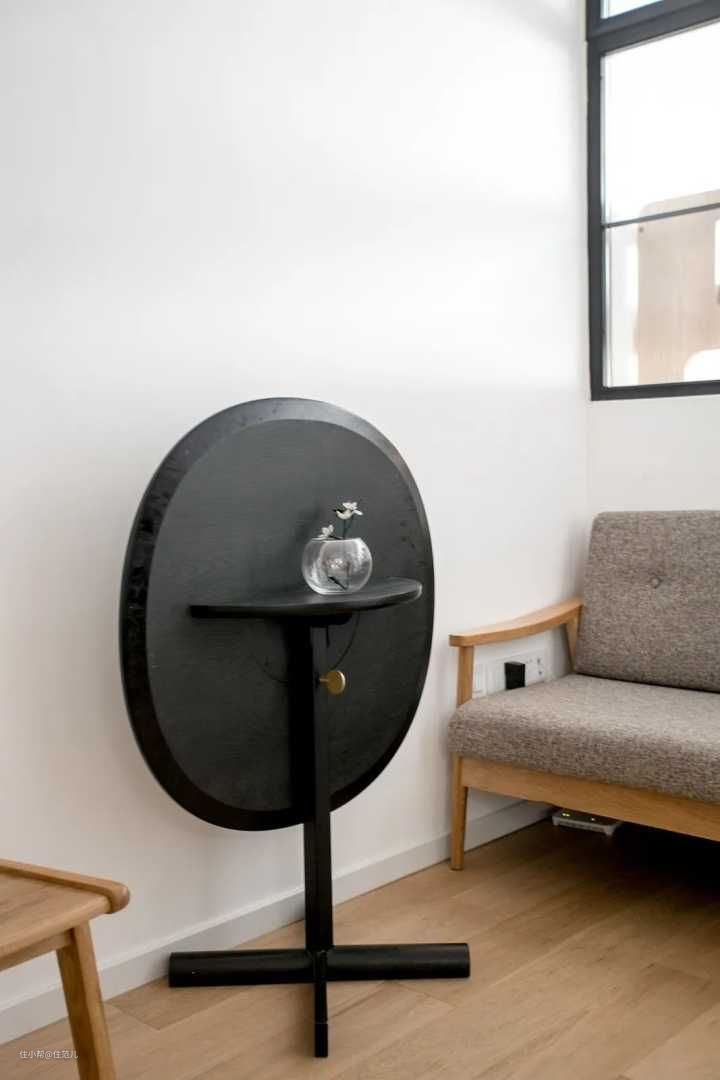 娟姐家墨绿色的圆桌,是吱音的树哲桌,平时不用的话,可以将桌面折叠起来,靠墙作为置物边桌。