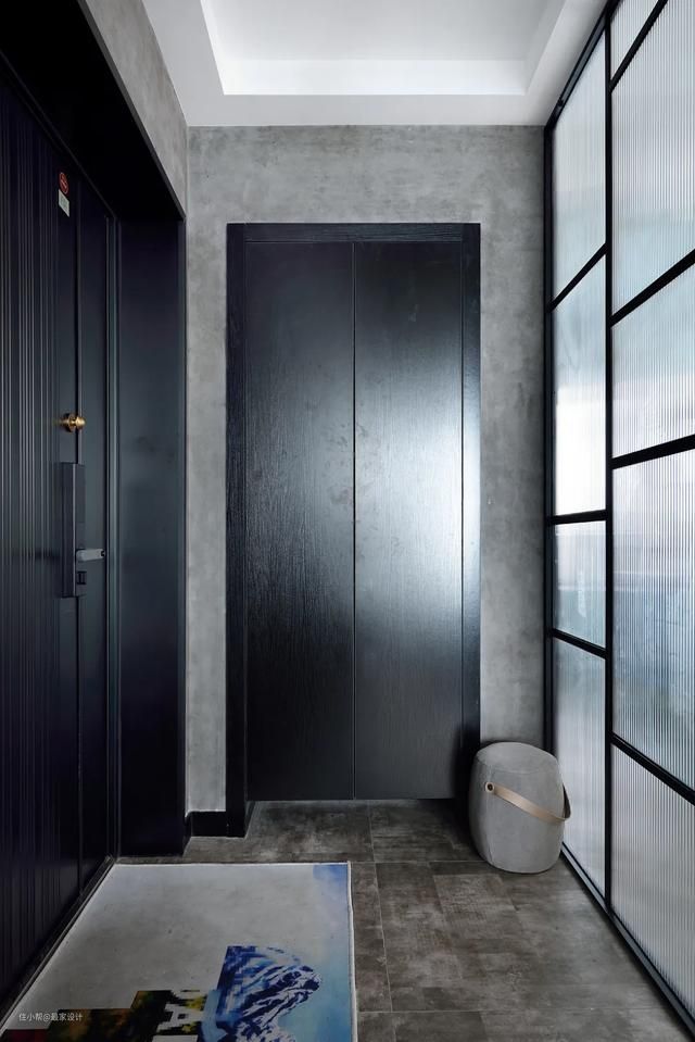主卧门也是用长虹玻璃,黑铁框门套与整体相呼应。设计师朱志明说,很多家里都会用木头的门套,厚重不好看,潮男是不会选择的。