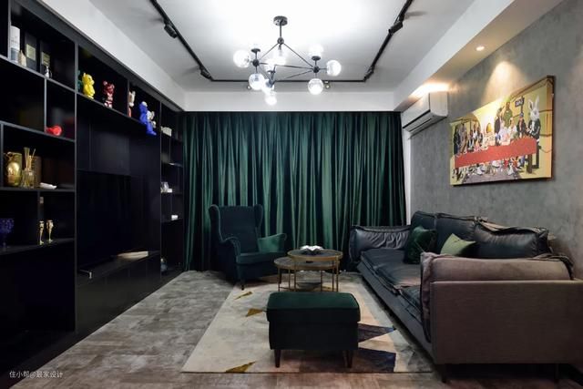 这个电视背景墙兼顾了实用和颜值,男主人把自己喜爱的手伴、旅行买的纪念品都摆在这里。柜子和门板的颜色,都是以黑色勾勒的,沙发背景墙是水泥漆,延伸到餐厅,这样两个空间的一体感就呈现出来了。设计师朱志明在客厅增加天鹅绒的沙发和窗帘,来柔和工业风的硬朗,墨绿色也是他特定的,看起来效果很好。